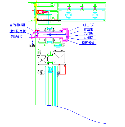 1、 外形尺寸: L×15×68mm;2、 通風(fēng)量:(1m/10pa)約為40 m3/h;3、 型材厚度:1.5mm4、 消音量:(開(kāi)/關(guān))32/35dB; 5、 水密性能:600Pa以上6、 顏色:按色板; 7、 配置:滑動(dòng)推式開(kāi)關(guān),面板可拆卸,內(nèi)襯過(guò)濾網(wǎng)方便清洗;8、 用于幕墻框上開(kāi)槽安裝。