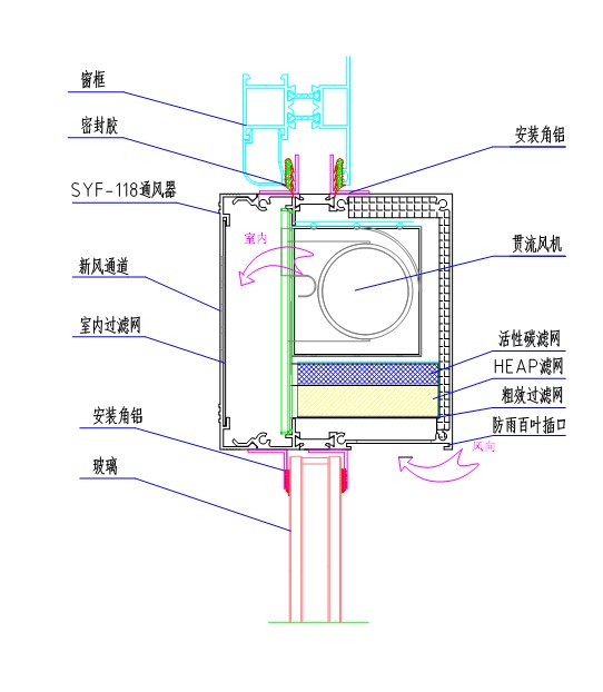 本產(chǎn)品是在與隔音窗配合使用的情況下達(dá)到室內(nèi)在隔離噪音的同時(shí)保持空氣流通的作用。在空氣的進(jìn)出通道上均設(shè)計(jì)有消音裝置,以隔離室外噪音,新風(fēng)在進(jìn)入室內(nèi)的通道中,在動(dòng)力作用下先經(jīng)過(guò)濾網(wǎng)過(guò)濾,再經(jīng)過(guò)消音、殺菌處理后送入室內(nèi)。室內(nèi)廢氣在氣壓差的作用下,經(jīng)排氣通道排向室外,完成室內(nèi)空氣循環(huán)。
