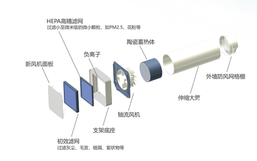 墻上打孔安裝,通過風(fēng)機(jī)正壓送風(fēng),在引進(jìn)室外新鮮空氣的同時(shí),可對(duì)進(jìn)風(fēng)進(jìn)行冷熱調(diào)節(jié),并有效去除空氣中的污染物。